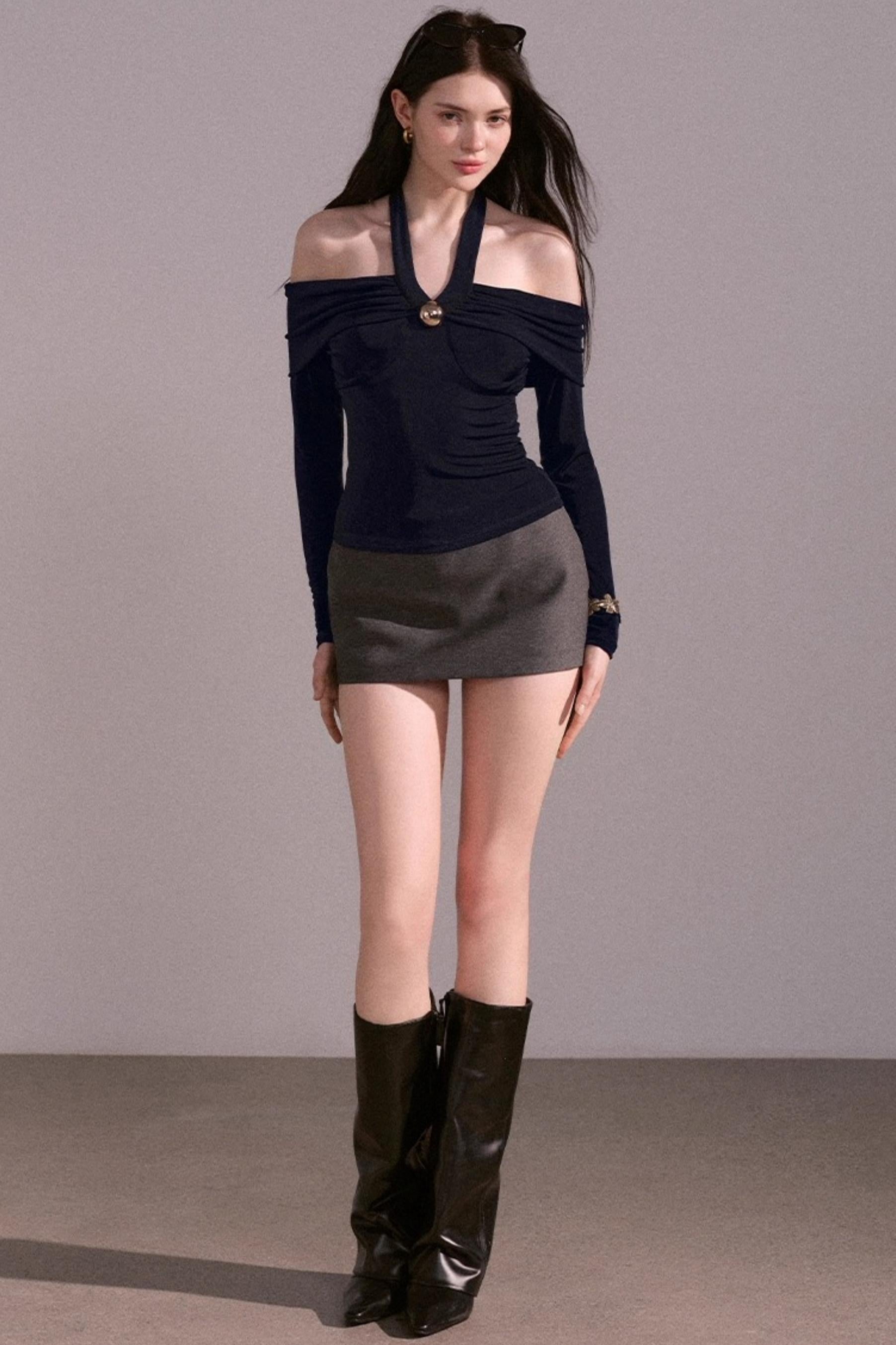 Sense Twisted Navy Halterneck Long Sleeve Top